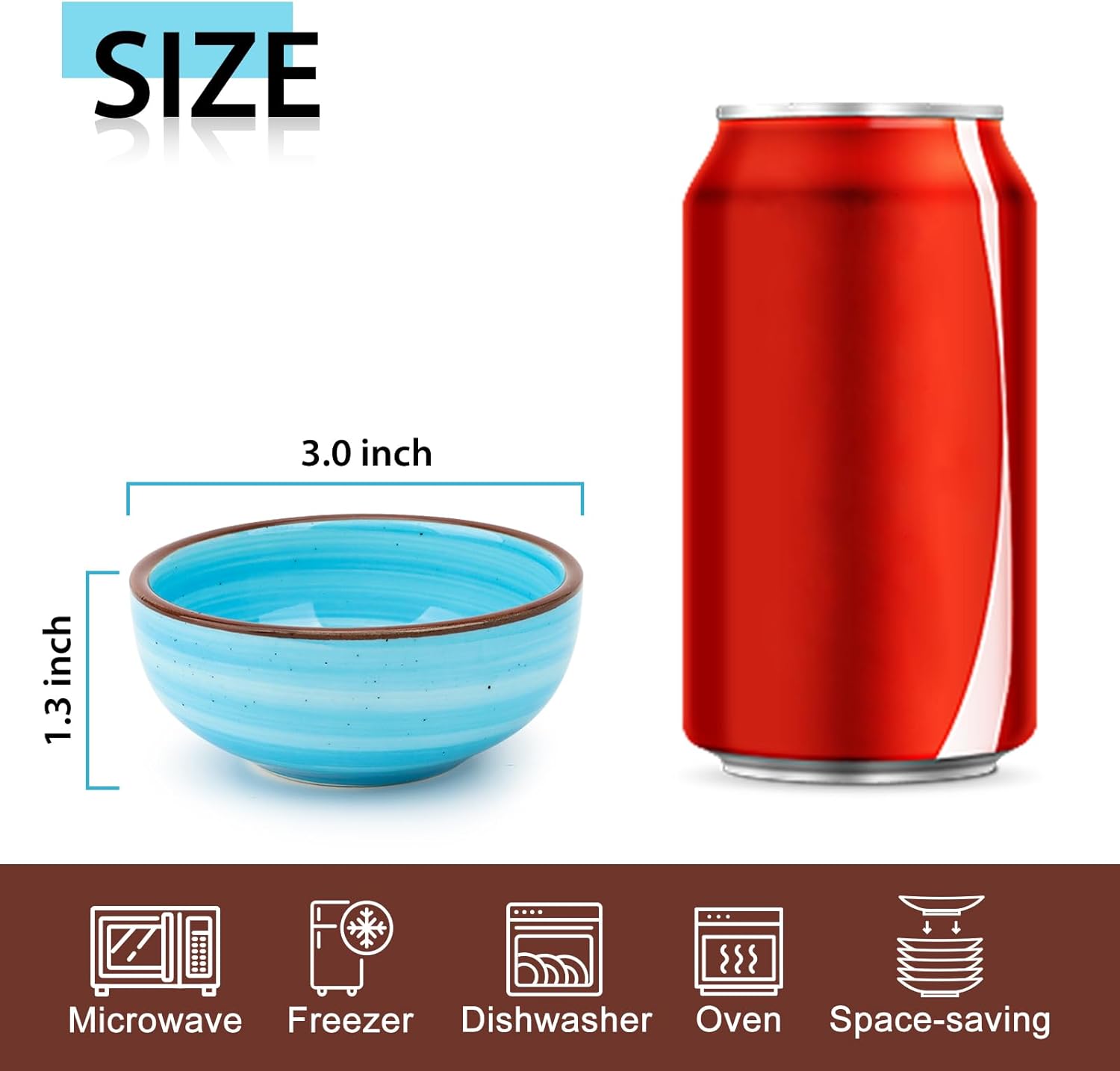 This set of 6 ceramic mini bowls measures 3 inches (7.6cm) in diameter and 1.3 inches (3.3cm) in height. Small in size yet versatile in function, each set comes in random colors, adding fun and variety to your dining table. Perfect for everyday family use, entertaining guests, or brightening up any mealtime.